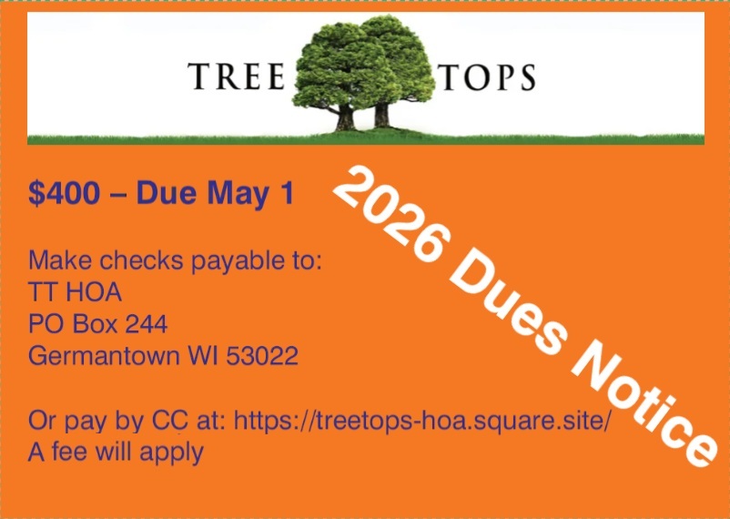 Tree Tops Homeowners Association’s annual dues for 2026 (now $400) are due on May 1, 2026. If you haven’t paid yet, please do so!